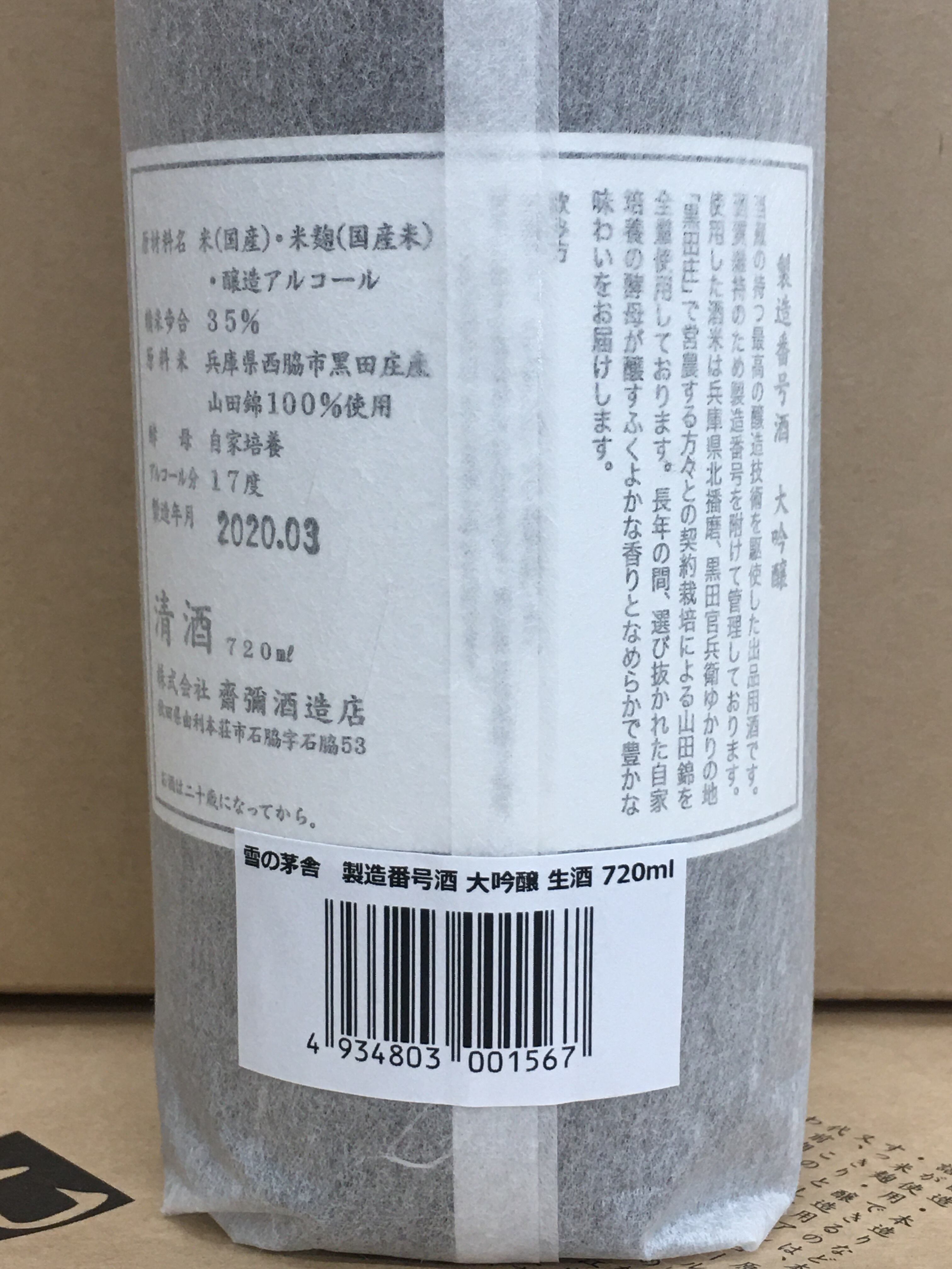 雪の茅舎 製造番号酒 大吟醸 生酒