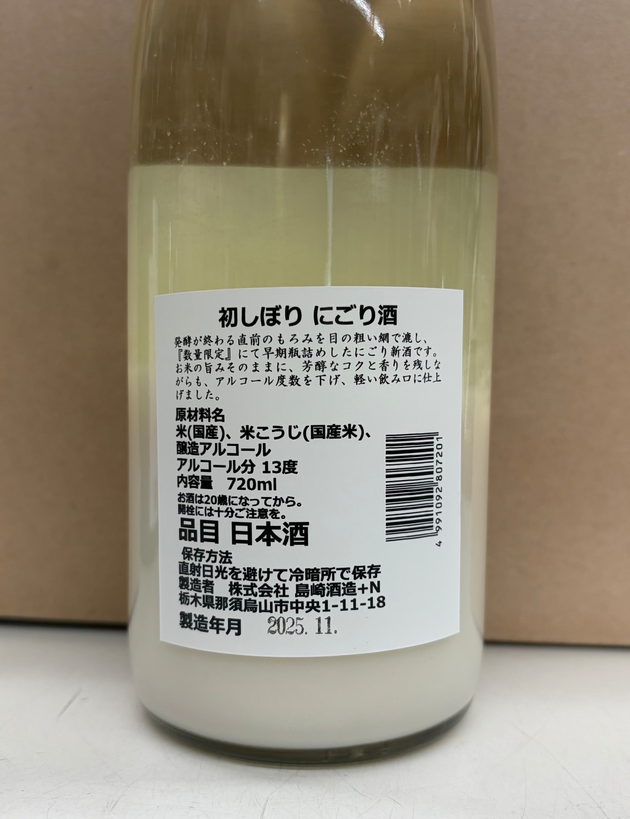 発酵が終わる直前のもろみを目の粗い網で濾し、『数量限定』にて早期瓶詰めしたにごり新酒です。